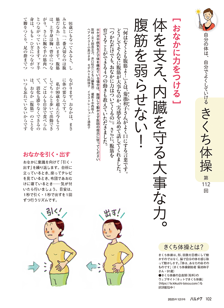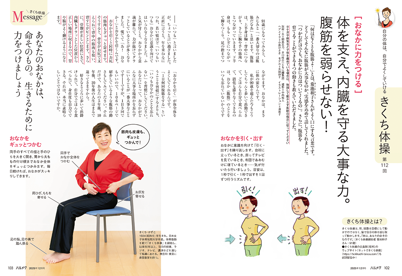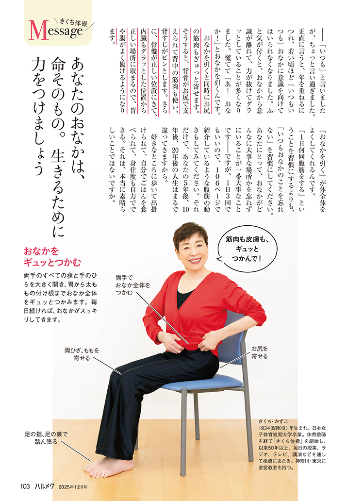 91歳にもなってみると、一番大事なのは腹筋だと思います。腹筋は、上半身は胸・背中につながり、さらに腕や手の筋肉へとつながっていきます。下半身は、もも・ひざにつながって脚をつくり、足の指までつながります。つまり、おなかはまさに体の要です。おなかを「ギュッとつかむ」「グッと引く」だけでも、それだけで腹筋に力がつき体全体がよくなりますよ。