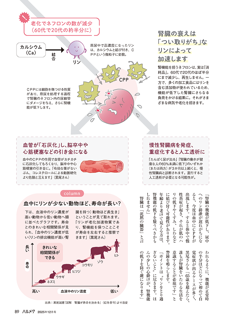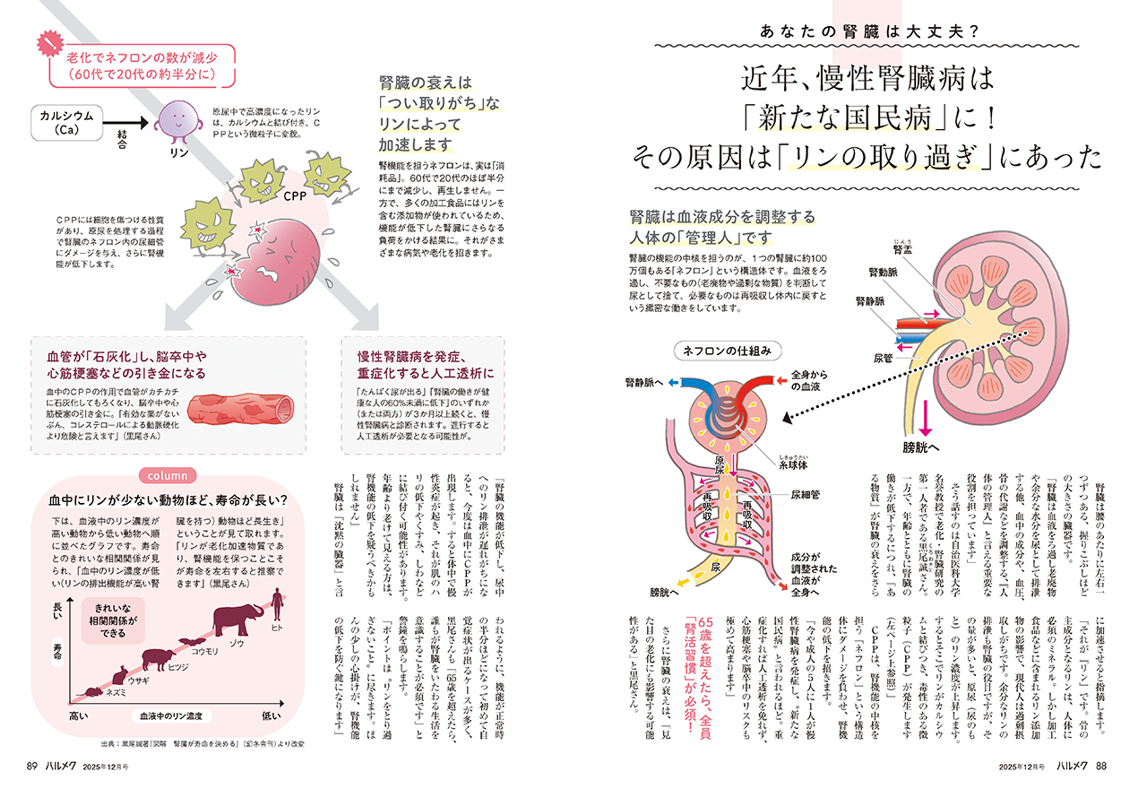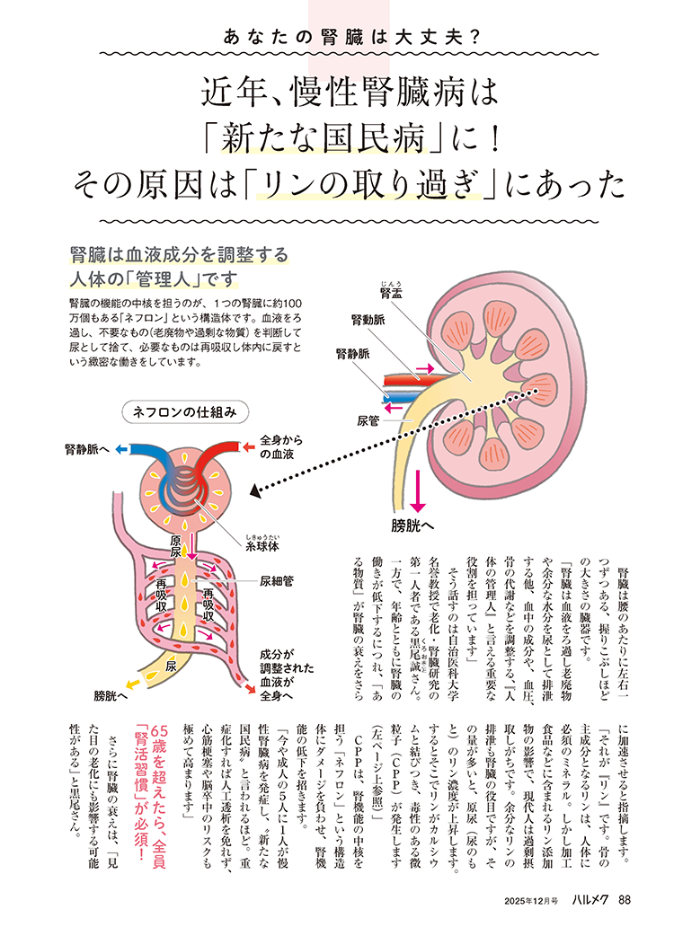 一方で「慢性腎臓病」は、いまや成人の5人に1人が抱える「新しい国民病」になっています。腎臓が衰えると、動脈硬化、心肥大などの病気だけでなく、全身の老化にもつながります。