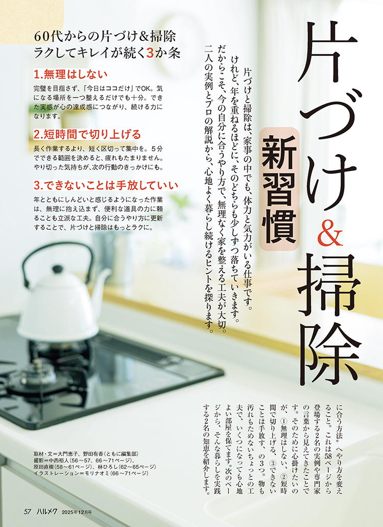 片づけと掃除は、家事の中でも、体力と気力がいる仕事です。けれど、年を重ねるほどに、そのどちらも少しずつ落ちていきます。だからこそ、今の自分に合うやり方で、無理なく家を整える工夫が大切。