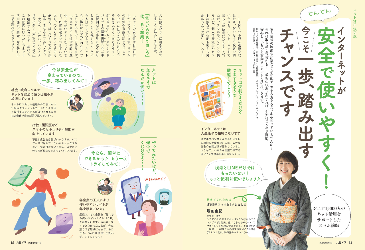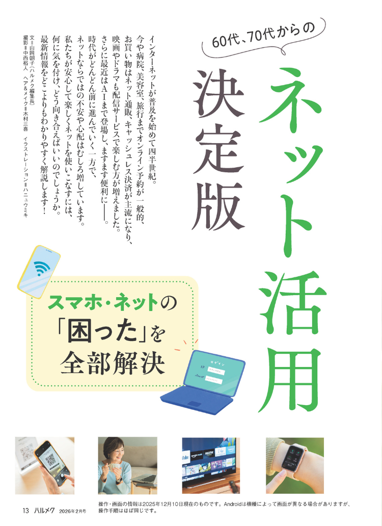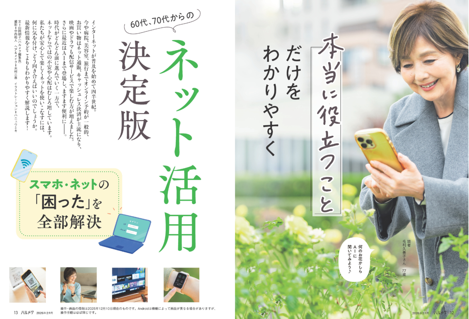 各種サービスの予約や買い物、映画やドラマの配信など、インターネットであらゆることができるようになりました。便利になった一方で、個人情報の流出やネット詐欺など、新たな心配も。本当はもっとネットを使いたいのに、「騙されそうで怖い」「操作を間違えたらどうしよう」と、二の足を踏んでしまうことはありませんか。今回の特集では、そうした不安やモヤモヤの正しい対処法をかみ砕いてやさしく解説します。さらに、無限にあるネット活用法の中から、この世代の女性におすすめのワザを厳選してご紹介。もちろん、今話題の「AI」についても取り上げ、「ネットで暮らしをもっと便利に楽しく」を徹底的にお手伝いします。