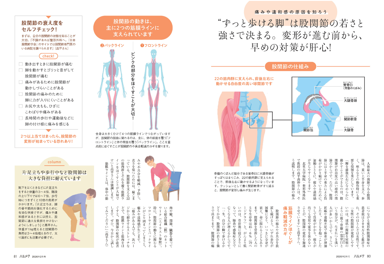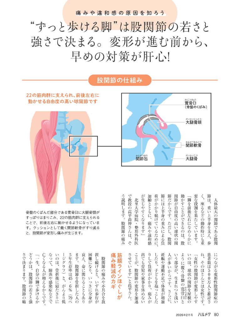 「立つ」「座る」「歩く」などあらゆる動作に関わっており、痛みや不具合があると外出がおっくうになり、筋力低下から寝たきりにつながることも。自分の脚で歩き続けるためにも身につけたい、股関節のセルフケアを専門医の高平尚伸さんが伝授します。