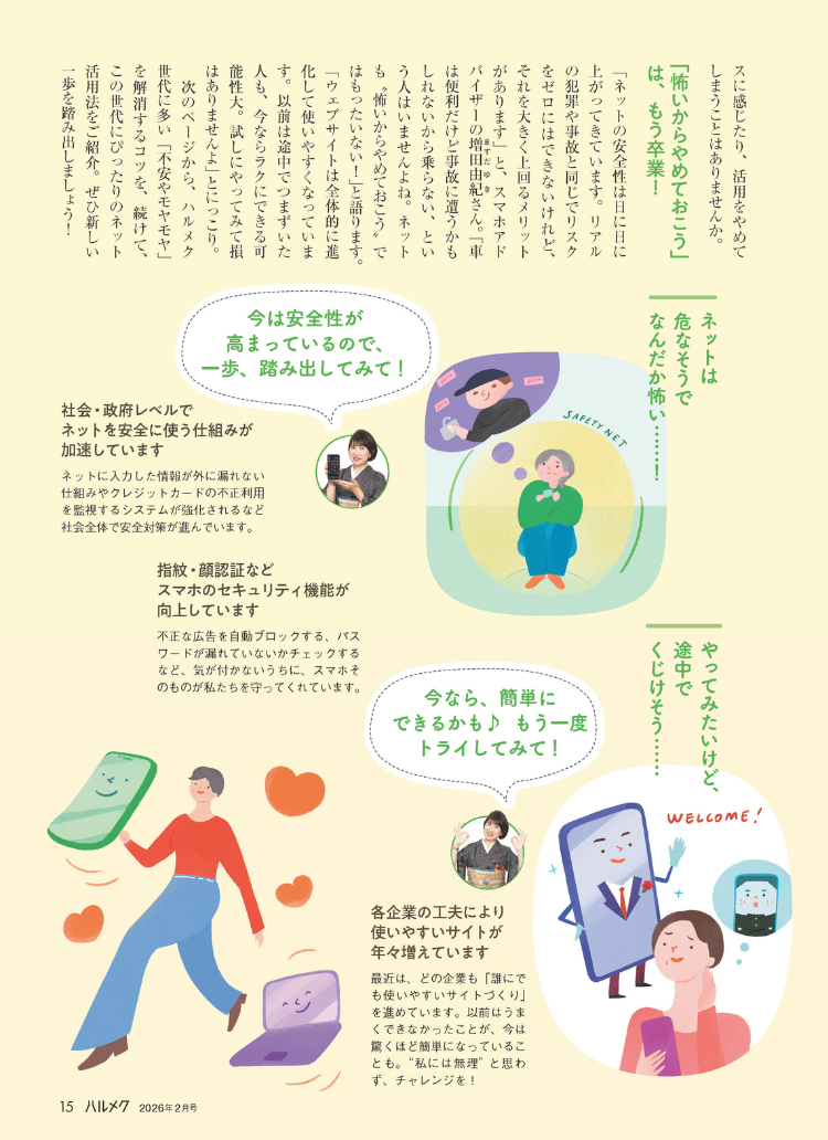 読者世代の女性にアンケートをとったところ、「ネット通販は使っていても、クレジットカード情報を入力するのが怖いから支払いは銀行振り込み」「間違ったら大変なことになるから躊躇してしまう」など、「漠然とした不安」が、ネット活用を阻む大きな壁になっていることがわかりました。確かに注意が必要なことは間違いありませんが、一方で、ネットの仕組みも日々進化しており、より安全に、より使いやすくなってきています。社会のIT化は加速度を増していて、「ネットは怖いからやめておこう」では、置いて行かれるばかり。「今のままでも困っているわけではないし」「教えてくれる人もいないから」と立ち止まらず、ぜひ今こそ一歩踏み出してみて欲しい、そんな思いでお届けする特集です。