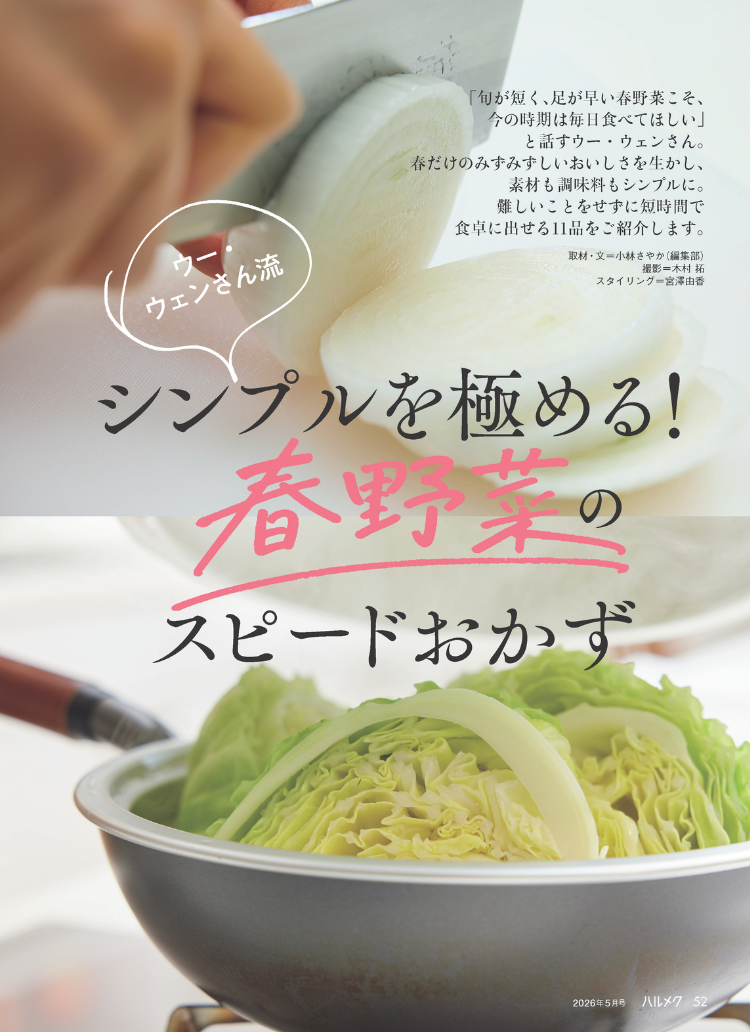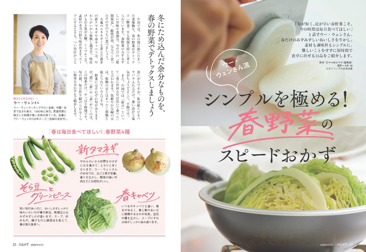 中国では春野菜は冬の老廃物を出す「解毒」の役割を持つとされます。新玉ねぎや春キャベツは、鮮度が良いうちに「引き算」の味付けを。出汁代わりに桜エビを使うなど、シンプルなほうが素材の持ち味が出ます。「新豆」もこの時季だけの特別。