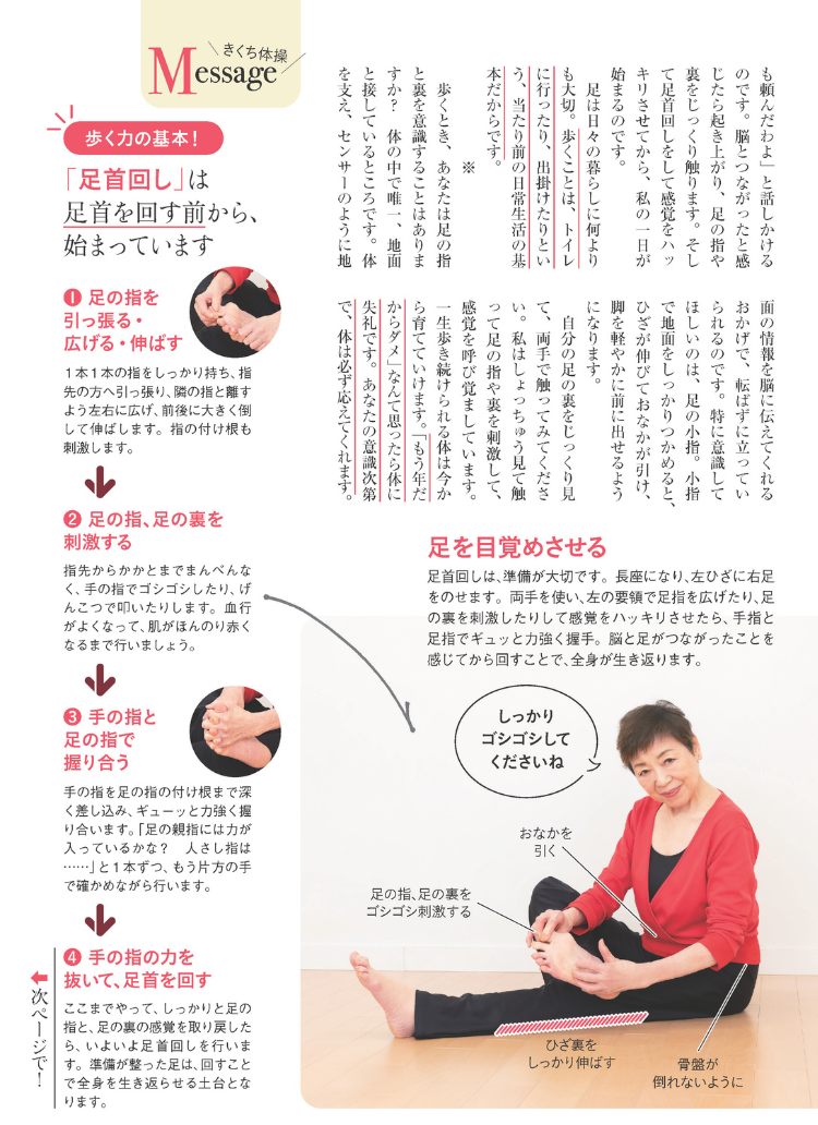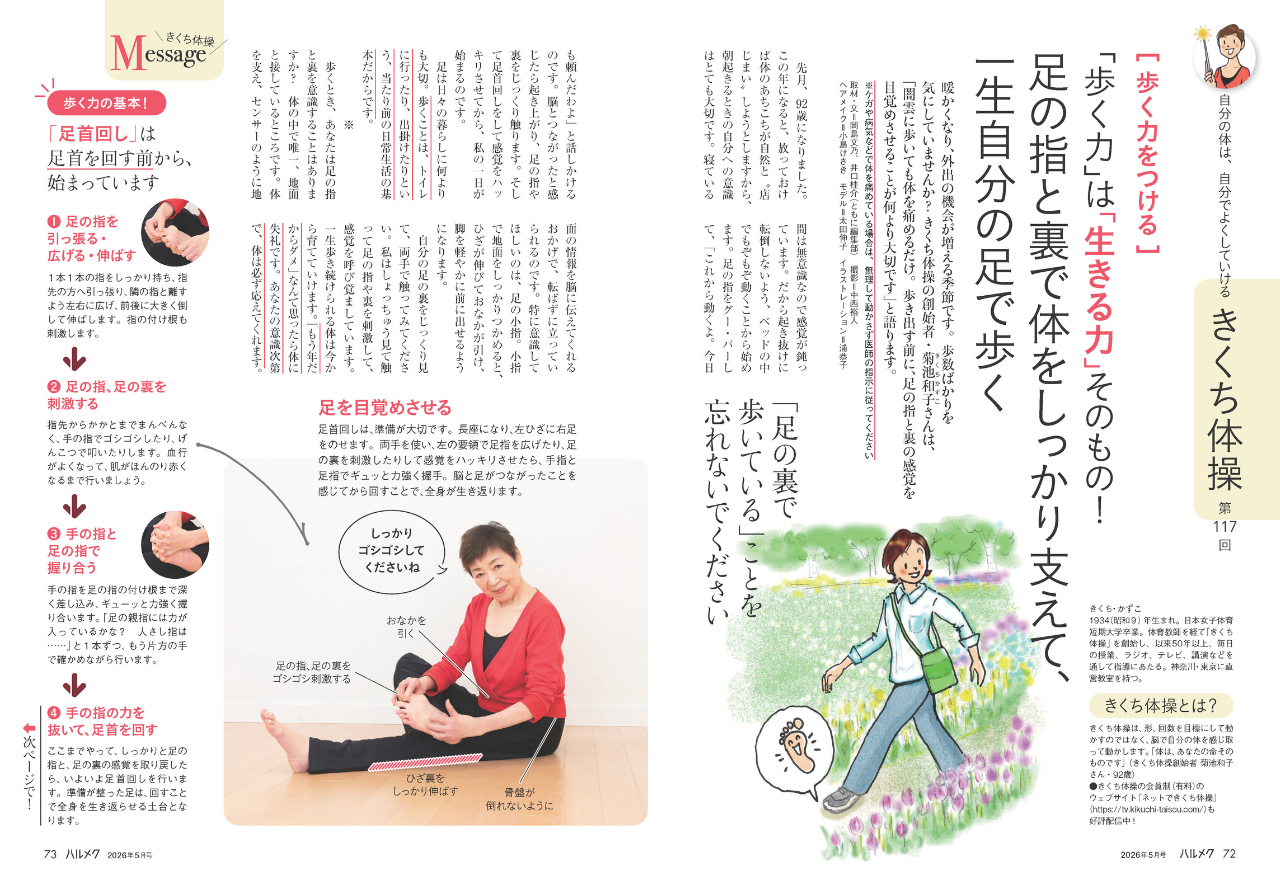 暖かくなり、外出の機会が増える季節です。歩数ばかりを気にしていませんか?菊池体操の創始者・菊池和子さんは、「闇雲に歩いても体を痛めるだけ。歩き出す前に、足の指と裏の感覚を目覚めさせることが何より大切です」と語ります。