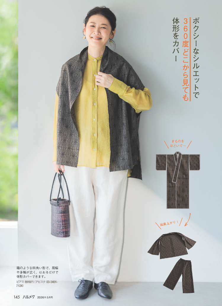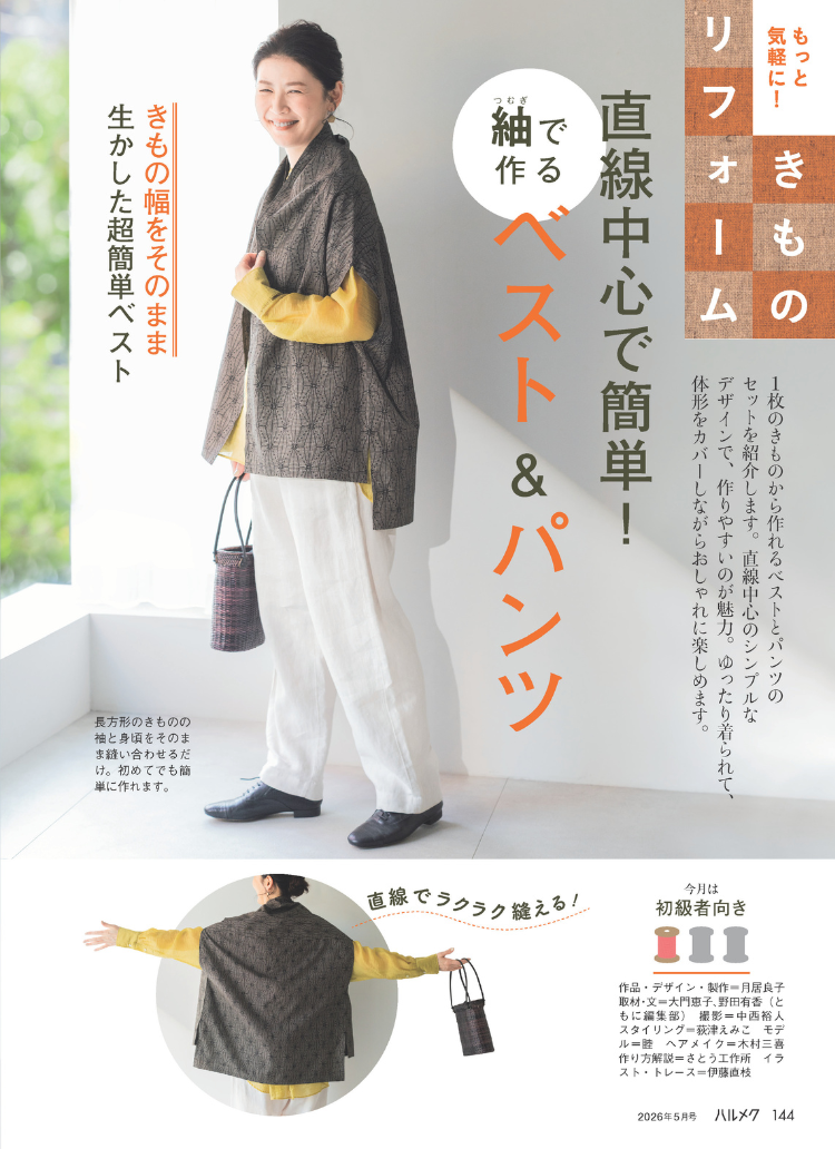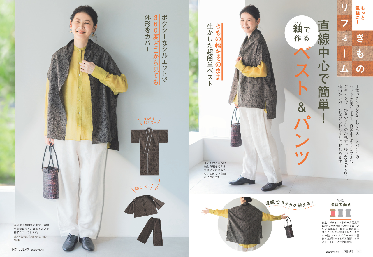1枚のきものから作れるベストとパンツのセットを紹介します。直線中心のシンプルなデザインで、作りやすいのが魅力。ゆったり着られて、体形をカバーしながらおしゃれに楽しめます。